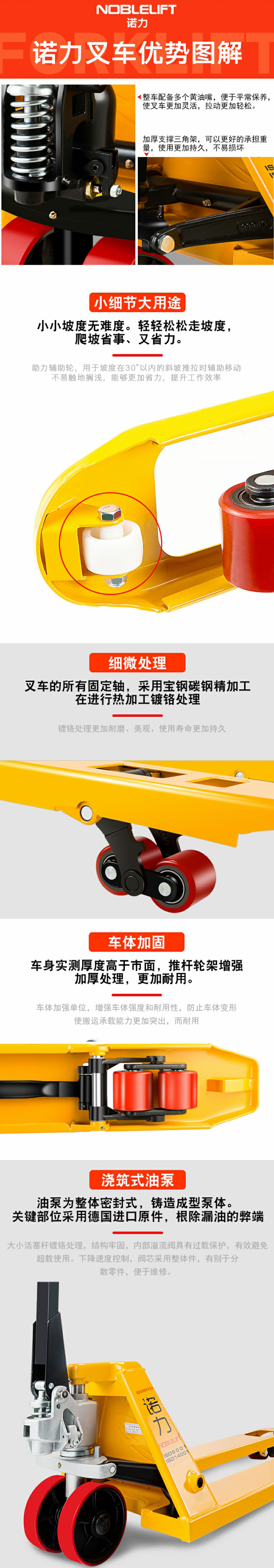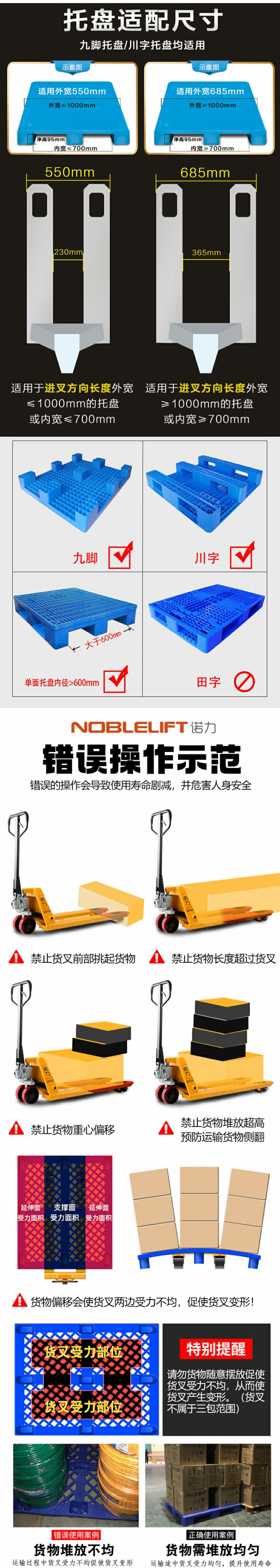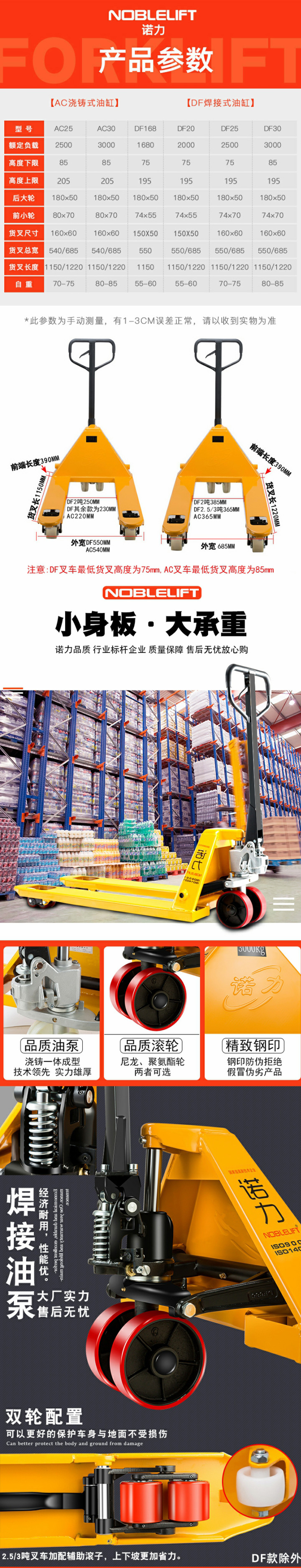 液壓手動(dong)搬運車 标準尺(chi)寸分寬車和窄(zhǎi)車,寬車685*1200mm,窄車 540*1150mm。一(yi)般來講,标準的(de)👉有2.0t-2.5噸-3.0t-5.0t,這4種載重(zhòng)量。國标的托盤(pan)高度一般在100mm,所(suo)以👅國标的手動(dong)液壓搬運車低(dī)高度當然在這(zhè)之下。一般的手(shǒu)動液壓搬運車(chē)🤟放到低點的時(shi)💜候高度是85mm、75mm兩種(zhǒng)。
