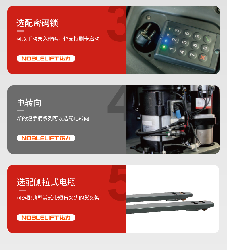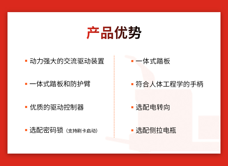 産品(pǐn)賣點 動力(li)強大的交(jiao)流驅動裝(zhuang)置 一體式(shì)踏闆和♌防(fáng)護臂 驅😘動(dong)控制器 選(xuan)配密碼鎖(suǒ) 一體式踏(tà)闆 符合人(rén)體工程學(xué)的手柄 選(xuan)配電轉向(xiàng) 選配側拉(lā)電瓶