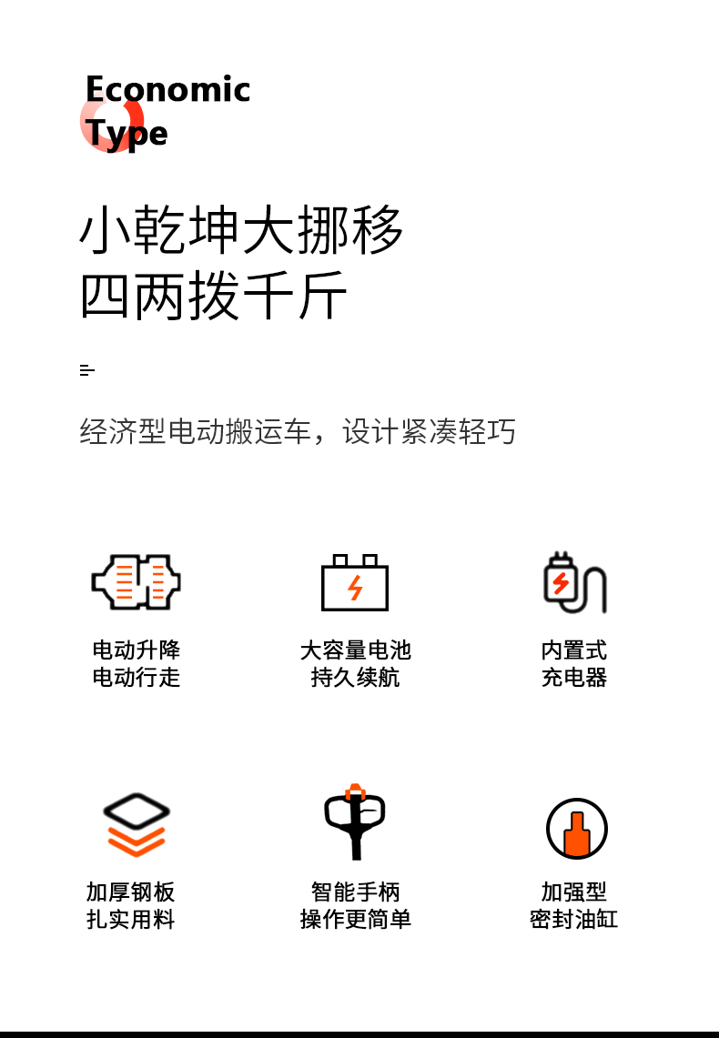 輕巧型(xing)電動搬(bān)運車,設(shè)計緊湊(còu)輕巧 産(chan)品賣點(diǎn) 低強度(dù)負載應(ying)用的理(li)想解決(jue)方案。 内(nèi)置式充(chōng)電器,具(jù)高度自(zi)主性。 低(di)電壓自(zi)動切斷(duan)提升動(dong)作的功(gong)能,延長(zhǎng)蓄電池(chí)壽命。 附(fù)加的穩(wen)定輪了(le)車輛操(cāo)作的穩(wen)定性。