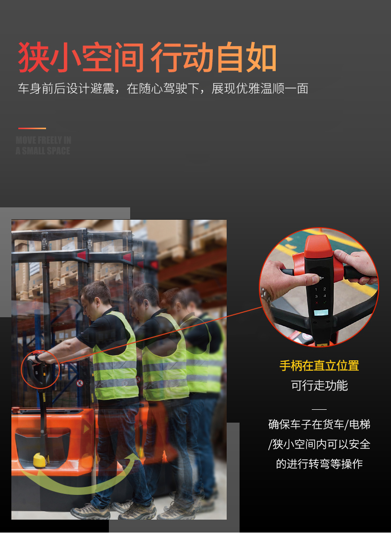 産品賣點(diǎn) 适用于小(xiao)噸位物料(liao)堆高搬運(yun) 中層樓高(gao)應用場所(suǒ)的理想選(xuǎn)擇 内置充(chōng)電器确保(bao)使用的高(gao)自主性 緊(jin)🛀湊&自重小(xiǎo) 12B:免維護鉛(qiān)酸電池/12N:快(kuài)充锂電池(chi) 多功能手(shǒu)柄,可操作(zuo)性強