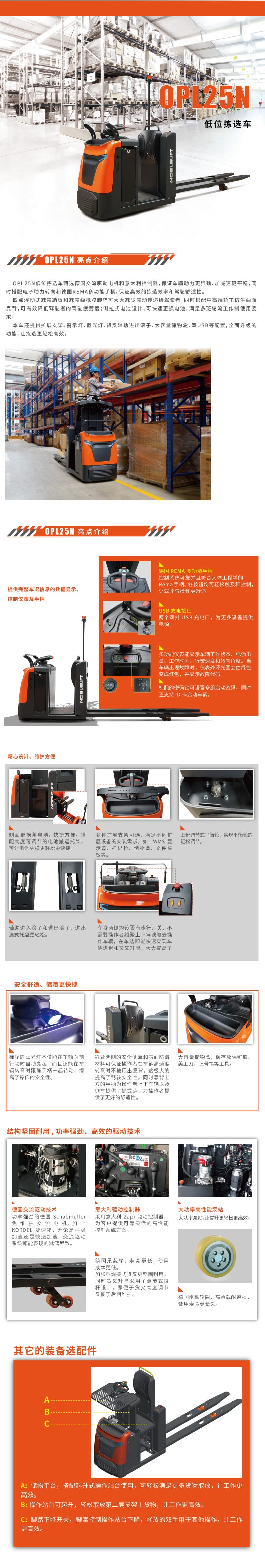 産品賣點 OPL25N低位揀(jian)選車甄選德國交(jiāo)流驅動電機和意(yì)🎯大利🔴控制器,車輛(liang)動力更強勁、加減(jiǎn)速更平穩,同時搭(dā)✂️配電子助力轉向(xiàng)和德國REMA多功能手(shou)柄,揀選效率和駕(jia)駛舒适🌈性。 四點浮(fú)動式減震踏闆和(he)減震級🐕橡膠腳墊(nian)可大大減少震動(dòng)傳遞給駕駛者,同(tóng)時搭🔞配中轎車仿(páng)👄生曲面靠背🧡,可有(you)效降低駕駛者的(de)駕駛疲勞度;側拉(la)式電池設計,可🌈快(kuai)速更換電池,滿足(zu)多班輪流工作制(zhì)使用要😘求。 本車還(hái)✌️提供擴展支架🏃♀️、警(jing)示燈、藍光燈、貨叉(cha)🏃♂️輔助進出滾子、大(dà)容🐉量儲物盒、雙USB等(deng)配置,全面升級的(de)功能,讓🔱揀選更輕(qing)松。